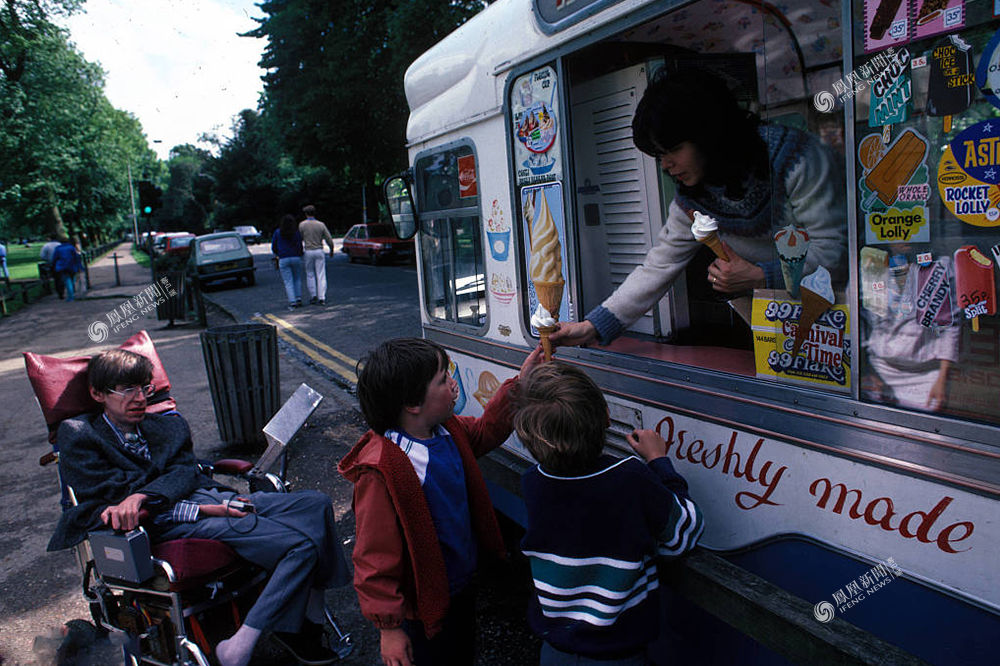 霍金21岁时患上肌肉萎缩性侧索硬化症(卢伽雷氏症),逐渐导致全身瘫痪,不能言语,手部只有三根手指可以活动。1987年,儿子(右)为霍金买冰淇淋。