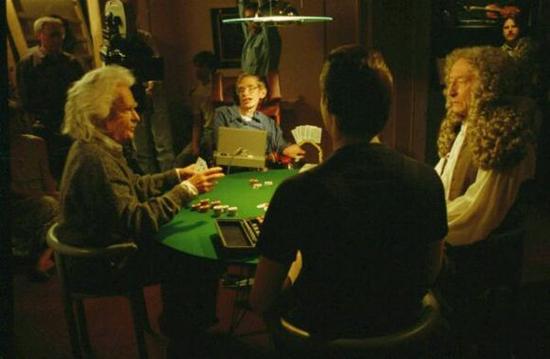 霍金首次“触电”,是在《星际迷航》中客串自己,与扮演牛顿、爱因斯坦的演员一起打牌。
