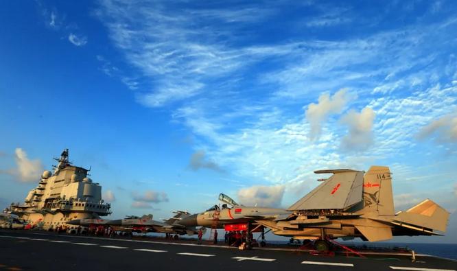 (△图为歼-15舰载战斗机呼啸起飞,直插云霄。图片来源:解放军报)