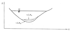 式中的n值一般介于0和1之间,它对河流的冲淤类型产生影响。如图所示的横断面,当n值较小时,如n=0.1,就意味着△Z分布相当均匀;如n值较大时,如n=1,△Z的分布不太均匀,并随局部推移力或大致随水深而发生局部变化。