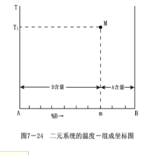二元系统相图中横坐标表示系统的组成,因此又称为组成轴。组成轴的两个端点分别表示两个纯组元,中间任意一点都表示由这两个组元组成的一个二元系统。假设二元系统由AB两组元构成,则两个端点A和B分别表示纯A和纯B。组成轴分为100等份,从A点到B点,B的含量由0%增加到100%,A的含量由100%减少到0%;从B点到A点则相反。如图。AB之间的任意点都是由AB组成的二元系统,如图中的m点是由30%的A和70%的B组成的二元系统。在相图中组成可以用质量百分数表示,也可以用摩尔百分数或摩尔分数表示,其图形有明显差别,应加以注意,纵坐标表示温度,又称为温度轴。