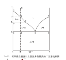 b.组成在AmBn~B范围内的二元系统,冷却到T1(加热到T2)时,固相反应的结果是A晶相消失,剩余B晶相和新生成的化合物AmBn。