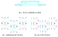 BJ塔板所采用的BJ浮阀是条形浮阀和舌形浮阀的结合体,BJ浮阀的前阀腿所开设的导向孔,其开孔的下缘与塔板面平齐(图2所示),因此不但起到对液流的导向作用,而且由于对塔板表面的吹气,增强对液体的搅动,防止固体沉积,可以避免焦粉在塔板上的沉积,可将塔板上的固体颗粒送入降液管中,并逐层带至塔底。图3为普通条型浮阀气体流动示意图,图4为BJ浮阀气体流动示意图,BJ浮阀塔盘的流动避免了返混,促进液体往降液管方向流动,其必将把不断减少的固体颗粒往塔底输送。