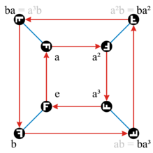 二面体群D4在两个生成元a和b上的凯莱图列于右侧。红色箭头表示左乘元素a。因此元素b是自我逆转的,表示左乘元素b蓝色线是无方向的。因此这个图是混合的:它有8个顶点,8个有向边,4个边。群D4的凯莱表可以从群展示得出: