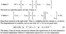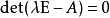 设M是n阶方阵, I是单位矩阵, 如果存在一个数λ使得 M-λI 是奇异矩阵(即不可逆矩阵, 亦即行列式为零), 那么λ称为M的特征值。