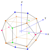 | 橙色的顶点位于(±1, ±1, ±1),形成了其一个内接立方体(虚线所示)。 | |