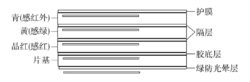 胶片假彩色成像假彩色照相就是通过照相系统把目标记录在彩红外胶片上。彩红外胶片是一种含有感红外线乳剂的多层彩色胶卷。彩红外片又称为“假彩色片“。彩红外胶片的结构如图所示。上层为红外乳剂层,能感红外辐射和兰光,产生青色正像; 中层为感绿乳剂层,感绿光和兰光,产生黄色正像; 下层为感红乳剂层,感红光和兰光,产生品红色正像。这种胶片没有黄色滤光层,因此在使用时,必须在相机镜头前加上黄色滤光镜( 黄-18或雷登-12) ,以消除兰光的影响,突出红光和红外波段,增强揭露伪装绿的能力。2