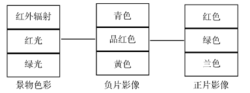 彩红外胶片的3层乳剂层各自只对一种基本色( 红外、红、绿) 的波段产生感光作用,从被摄对象射来的复合光,根据它对彩色感光材料的作用分为3种光谱成分,每种成分仅仅在感受此种光谱区光线的这一乳剂层造成潜像,通过显影、漂白、定影、冲洗,最终在感光层上只留下由染料形成的影像。各感光层影像的颜色不同,与被摄物色彩的对应关系如图所示。
