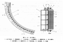 通风槽片大、中型水轮发电机大都采用径向通风系统。因此,在定子铁心段必须设计有一定数量的由通风槽片构成的通风沟。通风槽片由扇形冲片、通风槽钢及衬口环组成,见图3.3-21。通风槽片用的扇形冲片材料一般为0.65mm厚的酸洗钢板。酸洗钢板表面要求平整、光滑、不得有氧化皮或其他污迹。通风槽片在点焊通风槽钢时,齿部易产生变形致使碰上定子绕组。因此,通风槽片的槽型需要扩孔,以避免损伤绕组。一般槽型扩孔在直径方向增加2mm,槽宽方向也增加2mm左右。通风槽片在齿部槽楔部分的尺寸,通常依据比例图来选取,倒角也为60°,选取尺寸的原则是通风槽片在槽口部分不碰槽楔。