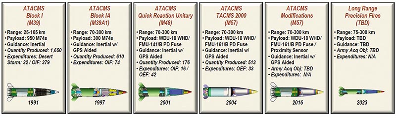 ATACMS系列导弹基本尺寸如下,弹长3.96米,弹径0.6米,弹重1158~1498千克,最大射程为110~150千米,命中精度为50米左右。服役时间为1991年1月,主要用来替代“长矛”导弹打击前线纵深目标,先后发展了Block1、Block1A、Block2、Block2A、Block3(后称为钻地型ATACMS-P)和Block4型(整体战斗部型),形成了6个弹种系列。