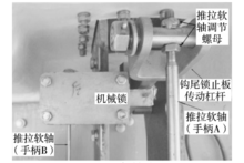 锁止板的升降靠手柄A通过推拉软轴驱动。手柄A是个很省力的杠杆,如果被大力扳动,即使锁止板没有上升到预定位置(即没有锁定钩尾),手柄也有可能被搬回到吊钩锁定时的位置。如此操作,会造成手柄A,推拉软轴和连接构件变形甚至损坏,更重要的是,如果操作者误认为吊钩已经被锁定而进行升艇,那么摔艇事故不可避免。