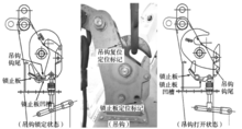 吊钩的锁定靠钩尾处的锁止板控制,锁止板上有1个凹槽。当吊钩需要打开时,操作手柄A使吊钩锁止板下降,钩尾脱离锁止板的凹槽后即处于自由旋转状态,在锁止板尾翅的推动下吊钩后仰即可呈打开状态。当吊钩需要锁止时,首先需要将吊钩回转到工作状态,此时钩尾处于吊钩旋转轴的正下方位置;然后操作手柄A使吊钩锁止板上升,直到钩尾完全陷入锁止板的凹槽内被
