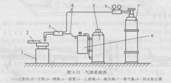 运用于气焊气焊设备是由焊炬、氧气瓶、乙炔瓶、减压阀、回火防止器、胶管等组成(见图2),是利用气体火焰作热源的焊接设备。5