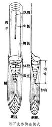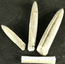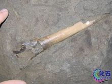 古无脊椎动物。头足纲,箭石类的统称。壳由鞘、闭锥、前甲三部分组成。闭锥是由凹面的隔壁构成的圆锥体。前甲是闭锥背部长而宽的突起物,很薄,难于保存。鞘呈圆柱状或圆锥状,通常是唯一能成为化石的部分。开始出现于早石炭世,在侏罗纪及白垩纪的地层中最多。(右为箭石鞘和闭椎部分)。