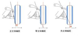 主销偏距与主销内倾是密切相关的。调整主销内倾角,可以得到不同的主销偏距。现代汽车的主销偏距一般在一18到+79 mm的范围内。主销偏距有正负之分。主销轴线与地面交点的位置在车轮内侧的为正,在外侧的为负。