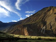 气温随着海拔高度的升高而逐渐下降,一般每升高1000米,气温下降约6℃,有的地区甚至每升高150米可下降1℃。高原大部分地区空气稀薄、干燥少云,白天地面接收大量的太阳辐射能量,近地面层的气温上升迅速,晚上,地面散热极快,地面气温急剧下降。因此,高原一天当中的最高气温和最低气温之差很大,有时一日之内,历尽寒暑,白天烈日当空,有时气温高达20~30℃,而晚上及清晨气温有时可降至0℃以下,这亦是高原气候一大特点。