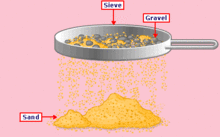 用筛孔尺寸不同的筛子将固体物料按所要求的颗粒大小分开的操作。常与粉碎相配合,使粉碎后的物料的颗粒大小可以近于相等,以保证合乎一定的要求或避免过分的粉碎。
