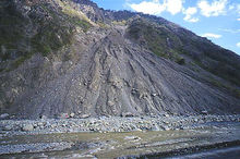 2,经常会夹杂大岩块或流木等材料,而大岩块走在先端呈滚动或滑动之方式流下。