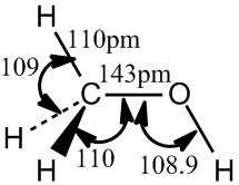 以甲醇为例说明醇的结构。在甲醇分子中,碳氧键的键长为143pm,∠COH键角为108.9°顾一般认为醇羟基中氧原子为sp³不等性杂化,氧原子的最外层的6个电子分布在4个sp³杂化轨道上,其中2个含单电子的sp³轨道分别与碳原子和氢原子形成碳氧键个氢氧键,剩下的两对未共用电子分别占据另两个sp³轨道。氢氧键和氧上两对未共用电子则与甲基的三个碳氢键呈交叉式优势构象。1甲醇的键长、键角以及甲醇和乙醇的球棍模型如下所示。