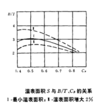 船宽对阻力的影响较之船长要小。就摩擦阻力而言,B/T在实用范围内的变化对摩擦阻力不会产生太大的影响。图3表明某系列船模的湿表面积S随B/T的变化情况。图中实线表明在一定方形系数时最小湿表面积的船模所对应的B/T值;图中虚线表示湿表面积增加2%时,B/T可在一个相当大的范围内变动。