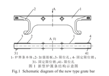 图1为新型炉蓖条的外形结构,其炉蓖条一侧端部有限位孔,另一侧对应位置有固定限位销;另一端则相反;炉算条旋转180°后,两端的限位孔、固定限位销的位置重合。相邻炉算条的限位孔、限位销形成连体装配。限位孔、固定限位销具有适当锥度,孔底部及销的头部为圆角,可改善铸造工艺性1。