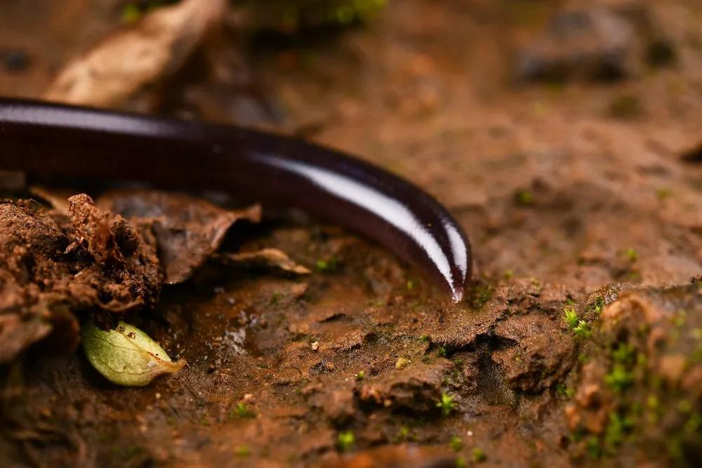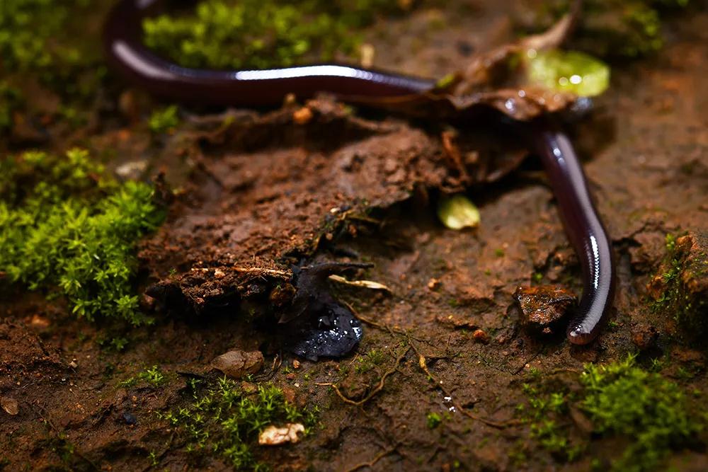 你若是对蛇状、蠕虫状的动物没有恐惧的话,近距离观察还能发现它们之间的更多差别。钩盲蛇的体表覆盖着覆瓦状排列的圆鳞,与一般蛇类不同的是,钩盲蛇的鳞片并没有背鳞与腹鳞的分化,周身的鳞片形状,大小均近似。而蚯蚓的身体是由数十条体节所构成,节与节之间具有被称为“节间沟”的沟槽,与钩盲蛇迥然不同。仔细观瞧还能发现,行进中的钩盲蛇会时不时吐出白色分叉的“信子”,彻底暴露了它的身份。
