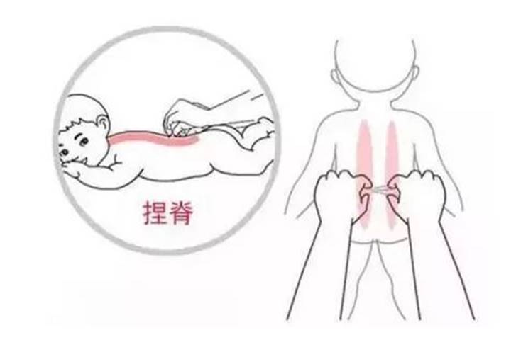 捏脊:让宝宝面孔朝下平卧,家长用两只手的拇指、食指和中指捏其脊柱两侧,随捏随按,由下而上,再由上而下,捏3-5遍,每晚一次。