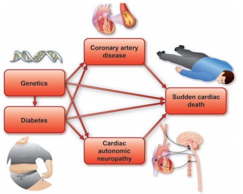 图1 除缺血性心脏病和突发心律失常死亡综合征之外,糖尿病引发心原性猝死的可能的途径