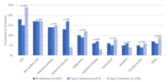 在14294例死者中,669例患有糖尿病,118例(18%)死于心原性猝死,112例(17%)死于非心原性猝死心血管病。