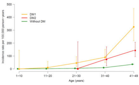 图3 不同年龄段伴有1型、2型糖尿病及不伴有糖尿病人群的心原性猝死发生率
