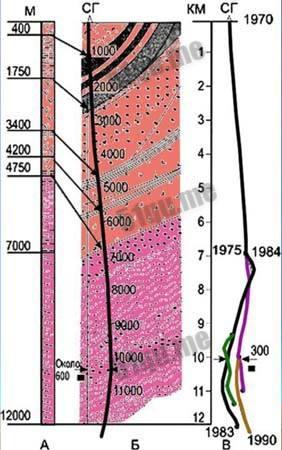 看上去简直就是活脱脱的好莱坞怪兽大片的剧本,但总的来说,上文的描述中有几个问题,首先这个超级深孔的垂直深度是12226米,也就是12.226千米,并非14.4千米,因为科拉深钻孔钻歪了好几次,其中一次还钻到了地下空洞,钻杆脱落无法取出,最严重的一次是已经钻入了12千米处,结果因钻杆脱落不得不从7千米处另起炉灶!