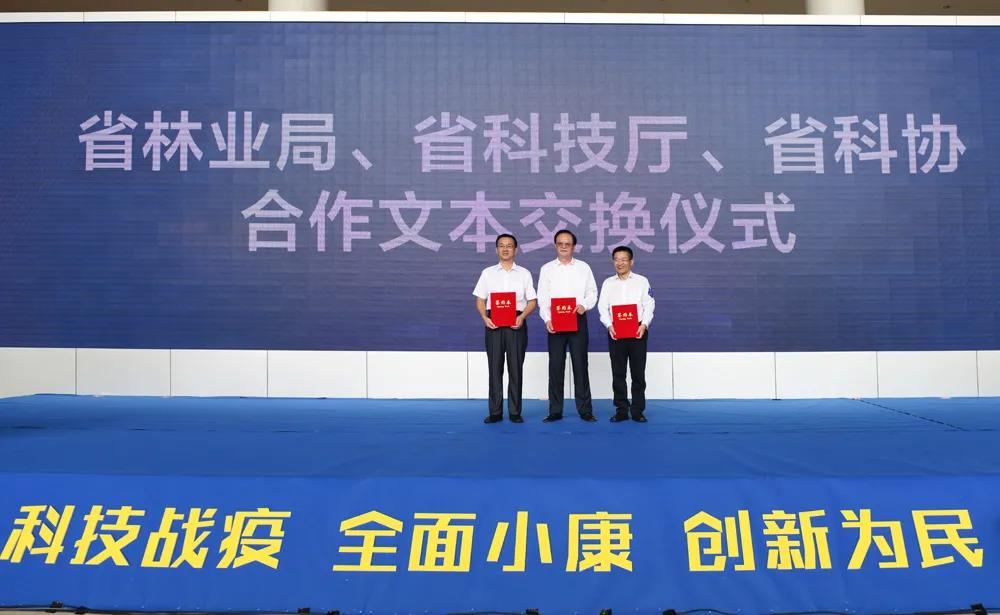 ▲省林业局、省科技厅、省科协交换加强林业科普工作合作文本
