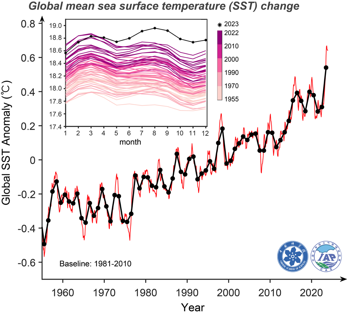 由人类活动造成的大气温室气体浓度持续增加,再加上厄尔尼诺事件的影响,全球海洋物理和生物地球化学环境在2023年发生了剧烈变化。2023年,海表温度和上层2000米海洋热含量达到历史新高。2023年上层2000米海洋热含量比2022年增加了15±10泽塔焦耳(1泽塔焦耳=1021焦耳)。