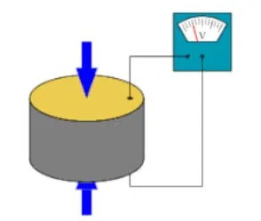压电效应材质的应变片改变形状后产生电压(夸张版示意图)