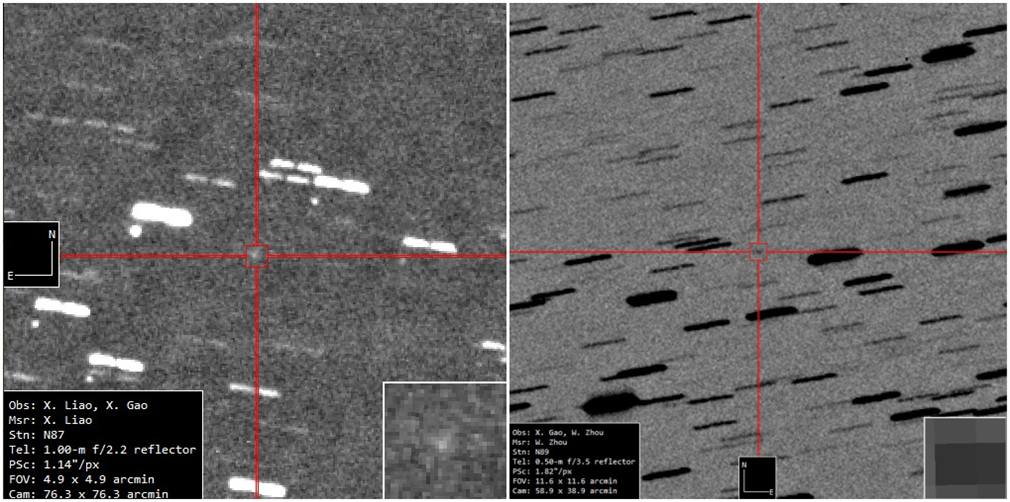 2024年3月9日,在中国科学院新疆天文台与星明团队合作的NAS小行星搜寻项目(NOWT Asteroid Survey)中,星明团队成员廖熙在新疆天文台南山观测站1米光学望远镜(NOWT)8日晚拍摄的数据里发现一颗移动目标,当时其亮度约为20星等。随后张宓、孙国佑、杨泽生、周文杰等人做了进一步验证,并将数据提交给国际小行星中心(MPC)。当晚,星明团队使用半米望远镜(HMT)对该目标进行了后随观测,周文杰、陈卓扬、张宓、杨泽生、廖熙等人进行了测量,所获得的数据也被提交至MPC。