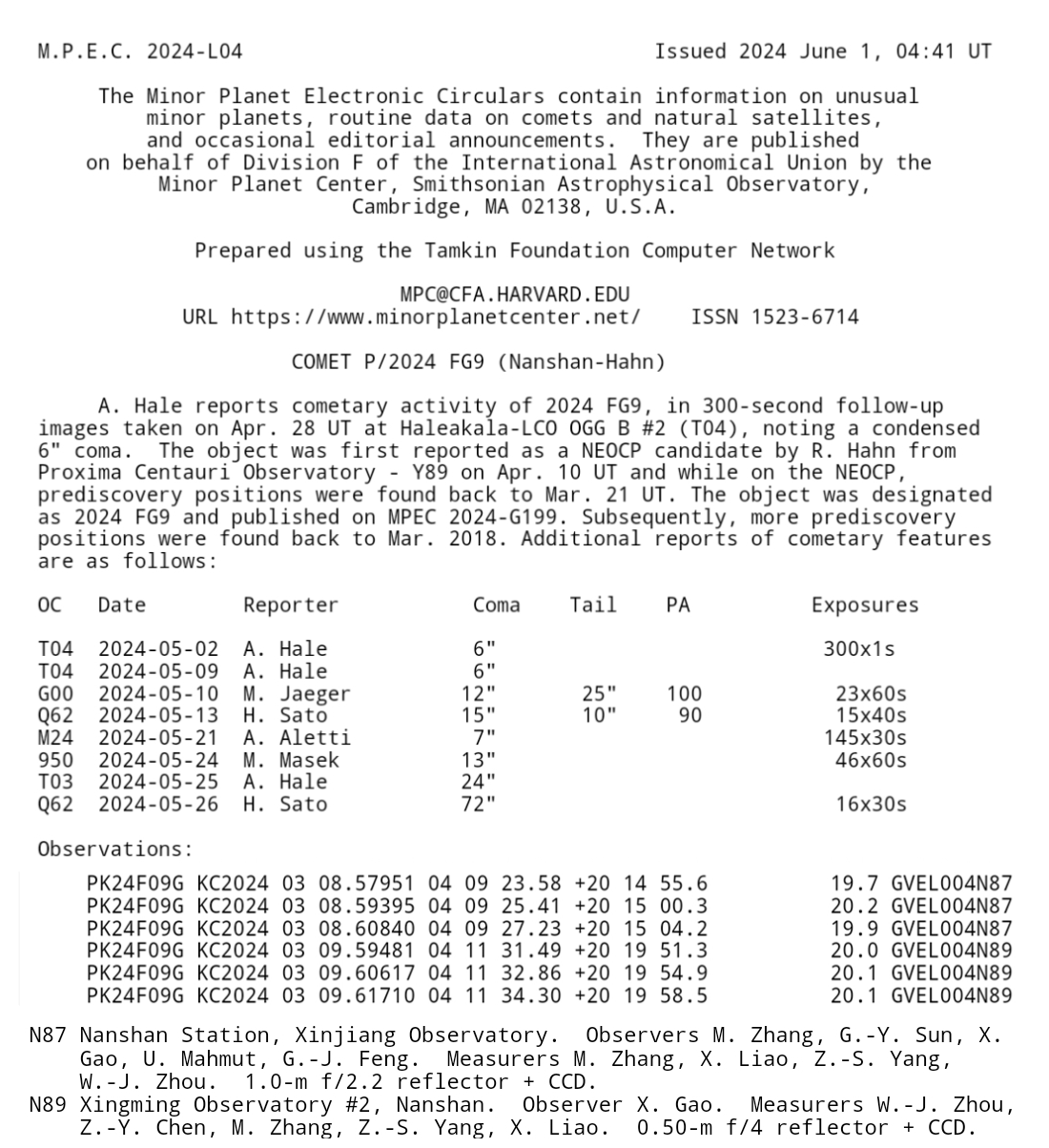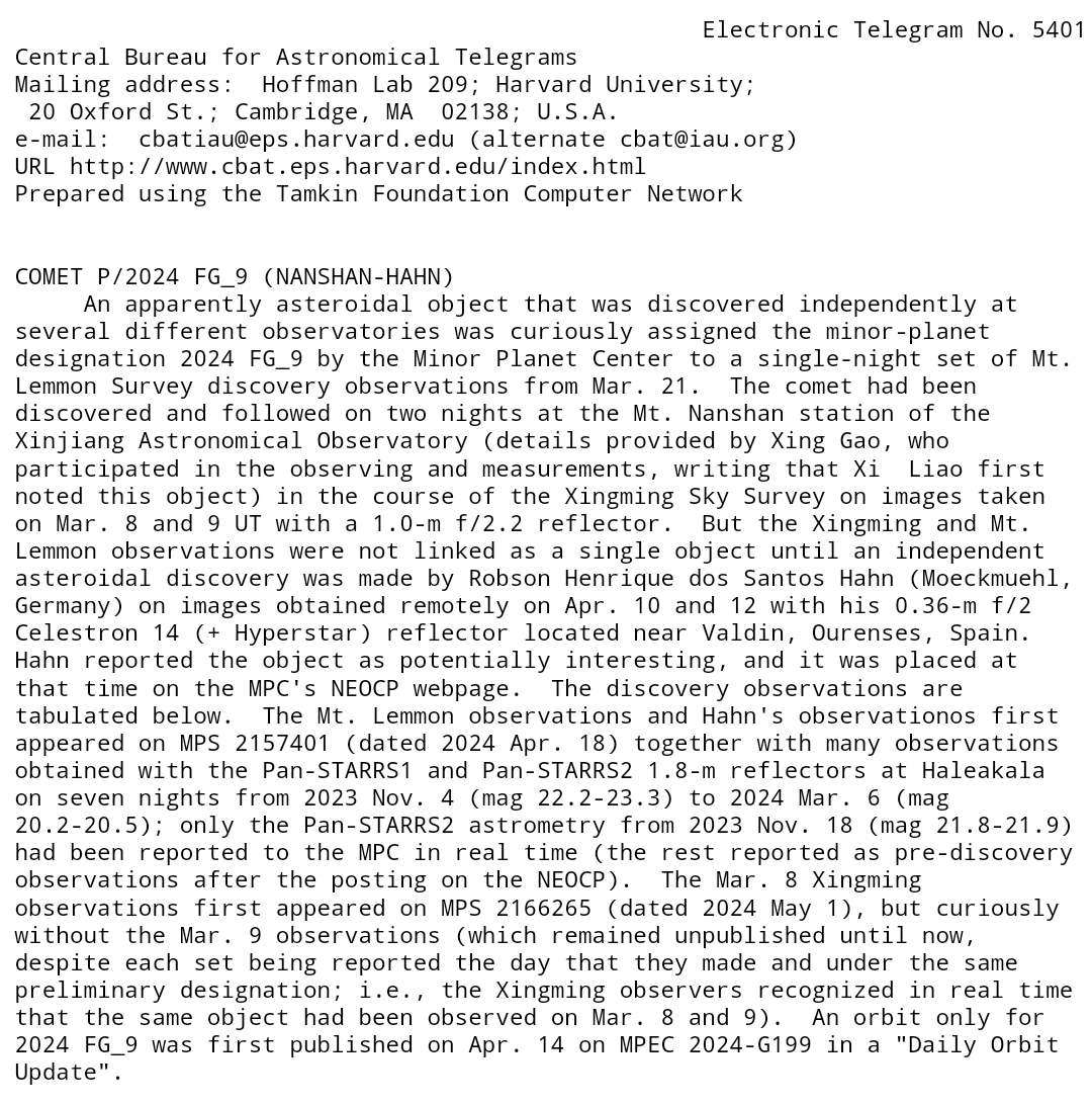 2、CBET 5401 : 20240601 : Comet P/2024 FG9 (Nanshan-Hahn),CBAT,http://www.cbat.eps.harvard.edu/iau/cbet/005400/CBET005401.txt