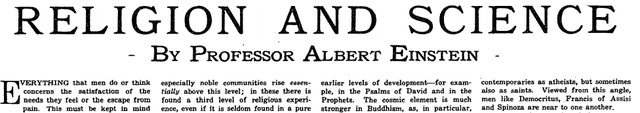 爱因斯坦的一生中有很多金句,其中反复出现过“宗教”和“上帝”这些词汇。1930年,在写给《纽约时代杂志》的文章“科学与宗教”中,爱因斯坦定义了“宇宙宗教体验”(cosmic religious sense)和“宇宙宗教经验”(cosmic religious experience)并进行了系统的论述。