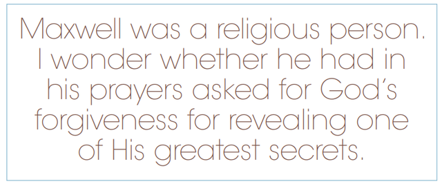 “有趣的是,麦克斯韦乃极为虔诚的教徒,我猜想他在祷告时也许祈求上帝宽恕其发现造物主创造光的秘密。”