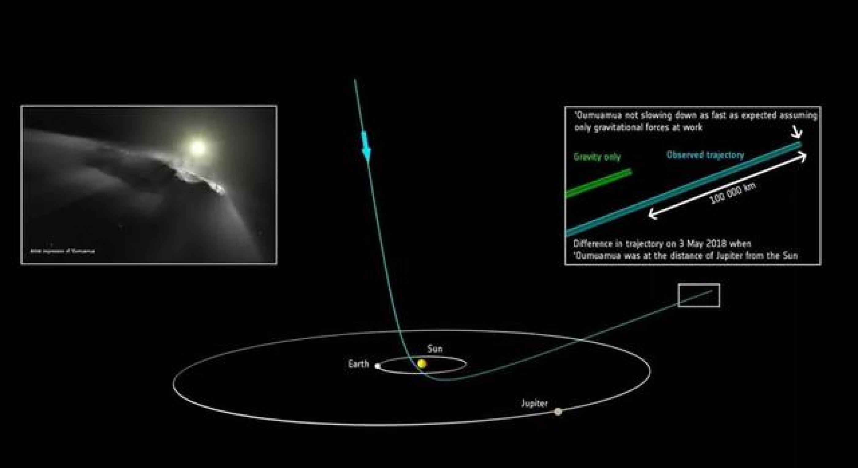 他们研究认为,这是一个被母星引力拉成长条的星子碎片,这块碎片经历了约60万年的旅行,来到了太阳系。现在它早就不在人类视野范围了,根据其运行速度,已经到了天王星和海王星轨道之间,目前的速度约29km/s。