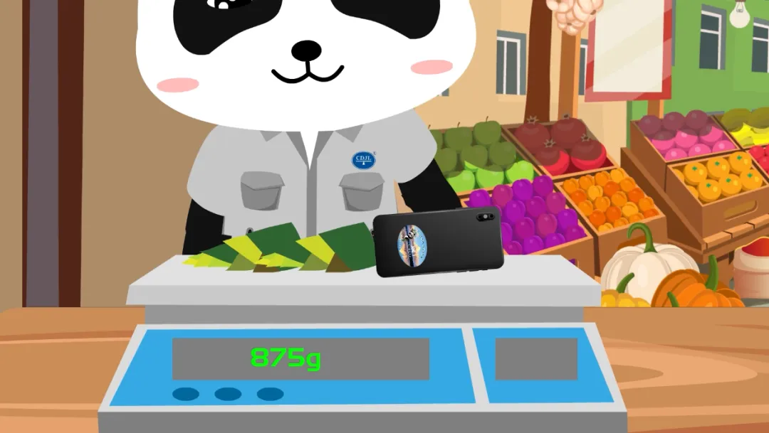 作品通过一个卡通小故事(小熊猫在菜市场遇到作弊电子秤,计量熊猫及时出现,通过手机变砝码的方式验证了作弊秤)。