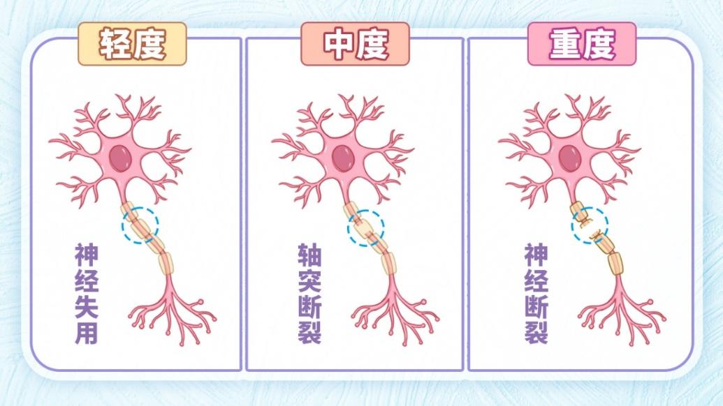 轻度损伤称为神经失用,指神经的外膜和轴突并未断裂,只是可能因外界挤压等因素,导致神经传导功能暂时性丧失。这类患者的预后通常较好。