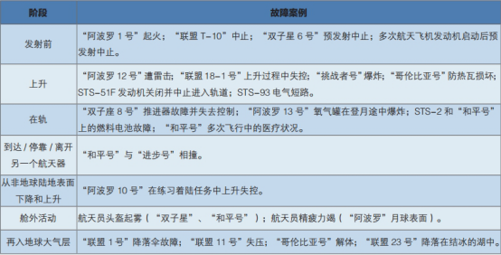 《载人太空飞行中的灾难与事故》一书对航天器事故和潜在事故做了统计,按上述7个阶段做了分类。