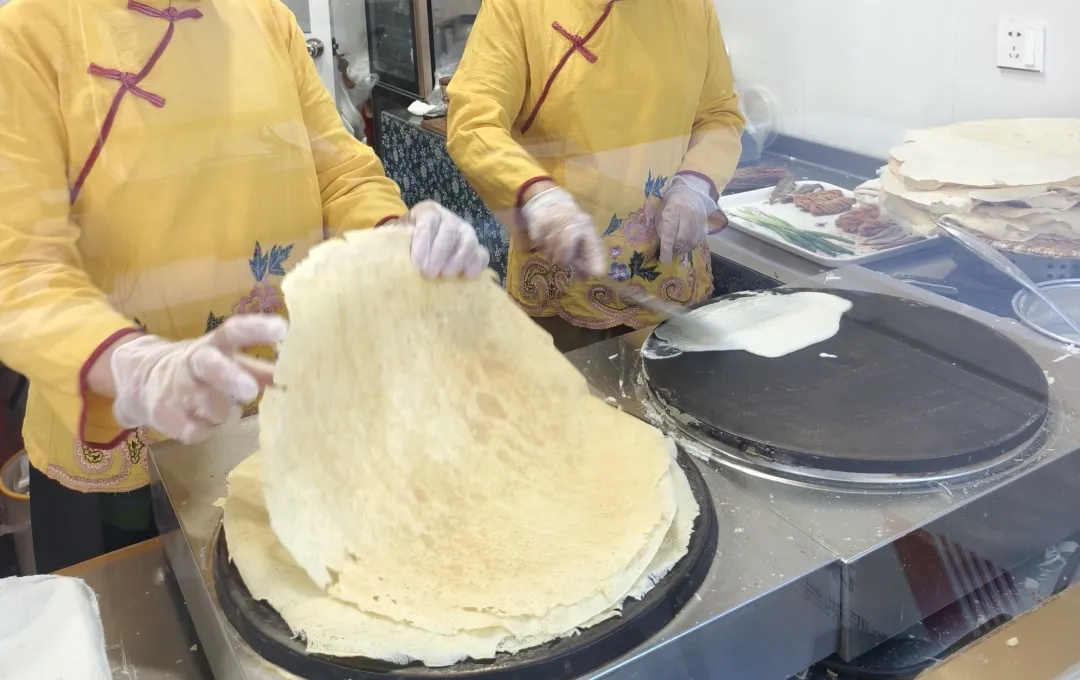 走进煎饼产业园,空气中弥漫着谷物焙烤后的醇香。这里采用自动旋转鏊台,一人可循环在6张鏊子上摊制煎饼,每小时产出煎饼约120张,效率提升3-4倍。