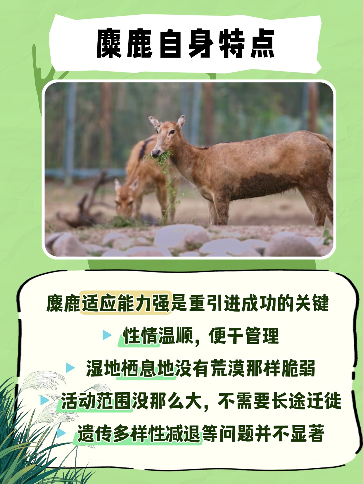 🔸生活习性友好:麋鹿虽需要广阔栖息地,但不长距离迁徙,喜欢慢悠悠“溜达”,还能长时间待在食物水源充沛的地方,这对保护区建设太有利啦👏。而且它脾气温和,警惕性强但不易受惊应激死亡,科研人员研究治疗都省心不少🥰。
