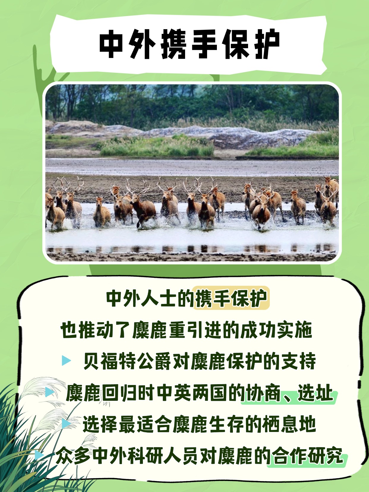 1985年后,中英反复磋商,众多科学家调研,选定历史分布地建保护区,政府大力投入,减少人类干扰,避免交通事故。如今,关于麋鹿人工授精、疫病监测等研究还在推进。
