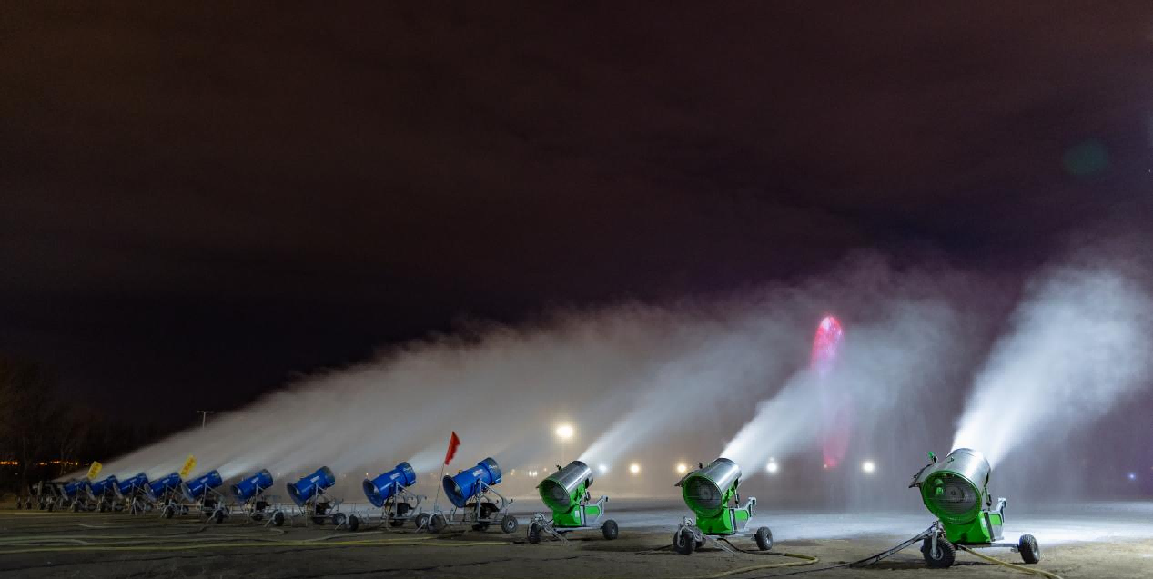 11月17日晚,第二十七届哈尔滨冰雪大世界造雪工作启动,多台造雪机同时开启、测试运转。随着技术人员对设备参数、造雪角度等的调整,皑皑白雪成功从造雪机中不断飘出。
