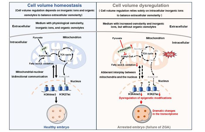 研究证实,渗透压微小的升高通过破坏胚胎内部离子浓度和有机渗透压调节物质的平衡而导致胚胎发育停止。通过调控线粒体代谢或添加有机渗透压调节物质恢复体积稳态,均可有效逆转渗透压微小升高诱导的胚胎发育停止。该成果为优化家畜胚胎培养、提升良种扩繁效率以及人类不孕症治疗提供了重要的理论依据与实践路径。