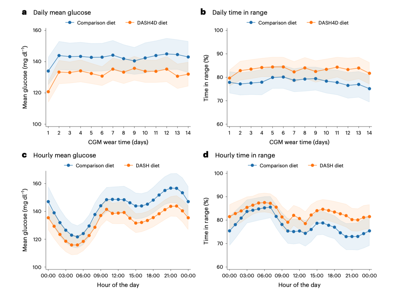 a–d, 连续血糖监测显示 DASH4D 饮食在白天(尤其 12:00–21:00)血糖显著更低、波动更小。
