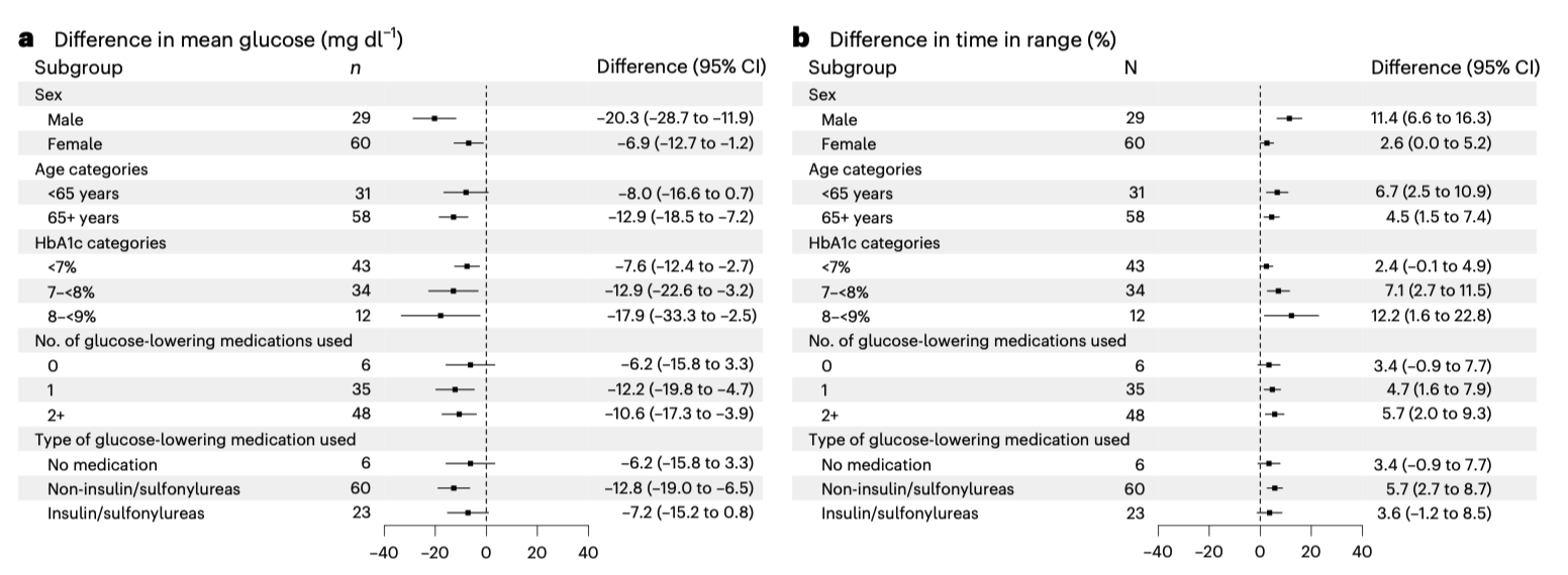 DASH4D 饮食在几乎所有亚组中均显著降低平均血糖并提高血糖稳定时间,