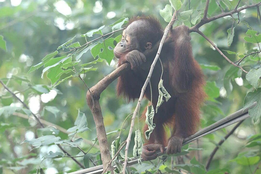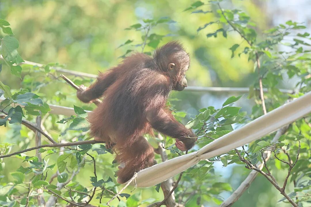 而在树冠层自在的穿梭,靠的是红毛猩猩超灵活的攀爬能力。他们能倒挂在树枝上、用脚勾住绳索翻转,宛如“树上瑜伽大师”,各类高难度动作信手拈来。